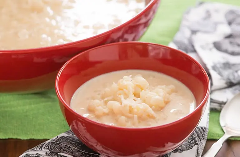 Feita com milho branco, leite, leite condensado e coco ralado, a canjica é cremosa e cheia de sabor. É perfeita para os dias mais frios de junho e pode ser servida quente ou fria.