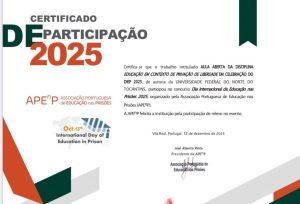 A Universidade Federal do Norte do Tocantins (UFNT) recebeu certificação de participação nas celebrações do Dia Internacional de Educação em Prisões 2025, concedida pela Associação Portuguesa de Educação em Prisões (ApenP). O reconhecimento foi atribuído à atuação da coordenação do Observatório de Leitura do curso de Letras Português, que desenvolveu ação acadêmica integrada às atividades da Licenciatura em Letras.